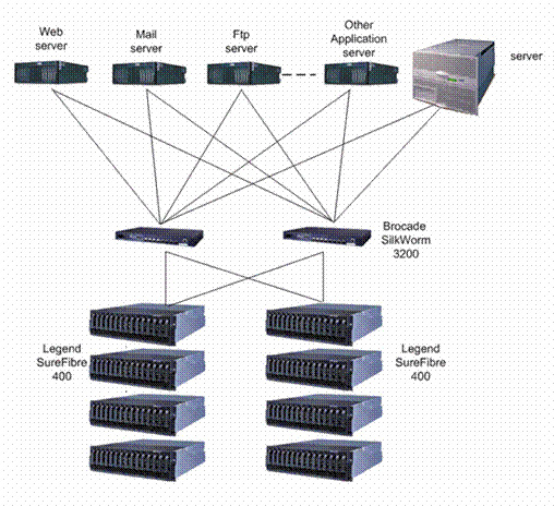 根據(jù)數(shù)字圖書館第一階段的實(shí)際需求,我們建議采用聯(lián)想SureFibre400R2光纖磁盤陣列柜,加上4個(gè)SureFibre400J2光纖磁盤陣列擴(kuò)展柜,總?cè)萘靠梢赃_(dá)到5.5TB,完全能夠滿足客戶數(shù)字圖書館項(xiàng)目第一階段建設(shè)的需要。中間采用Brocade SilkWorm3200光線交換機(jī),服務(wù)器通過兩條FC通道與交換機(jī)連接,達(dá)到單機(jī)雙工的要求。這樣的設(shè)計(jì)是為以后擴(kuò)容作準(zhǔn)備。