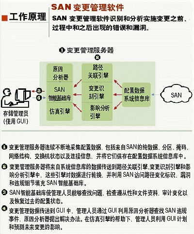 變更管理軟件可在整個(gè)變更、發(fā)展、遷移和合并過(guò)程中監(jiān)控SAN。當(dāng)有問(wèn)題發(fā)生時(shí),會(huì)通過(guò)電子郵件、SNMP(簡(jiǎn)單網(wǎng)絡(luò)管理協(xié)議)和GUI通知管理人員并向其發(fā)送一份原因解釋和解決方案的郵件。在問(wèn)題會(huì)影響應(yīng)用程序的可用性之前,警報(bào)會(huì)讓管理人員把問(wèn)題解決掉。
